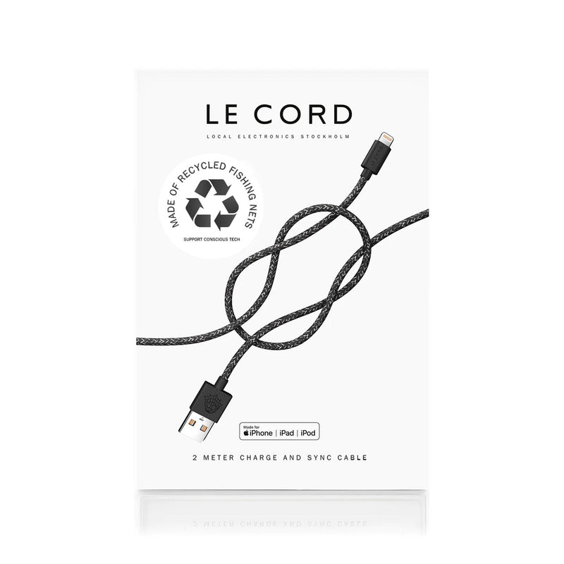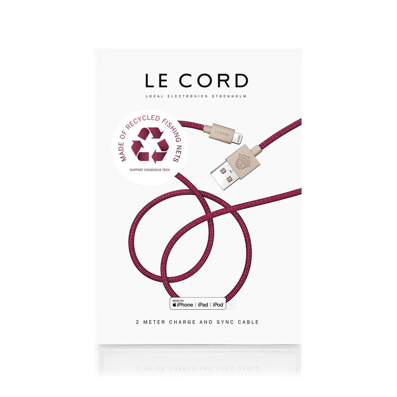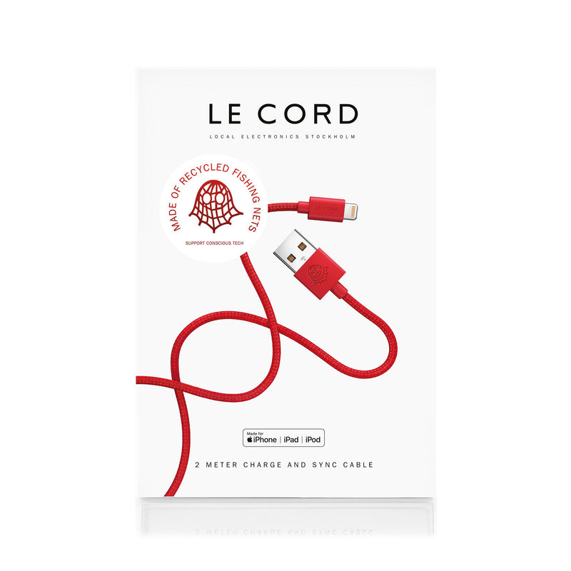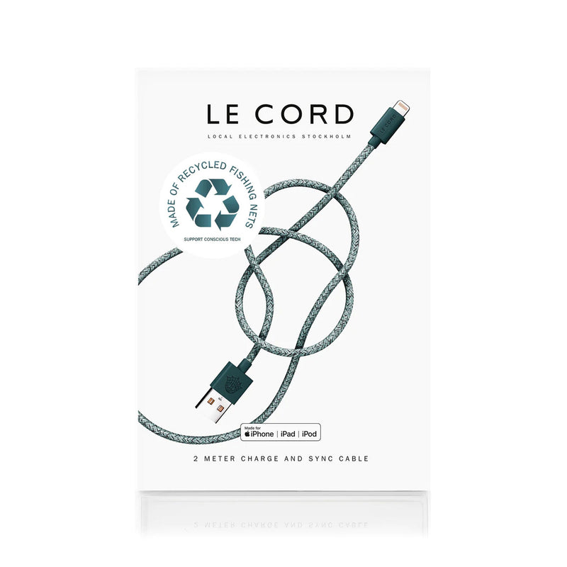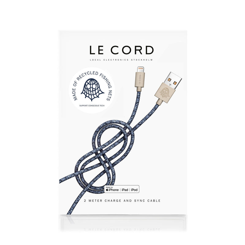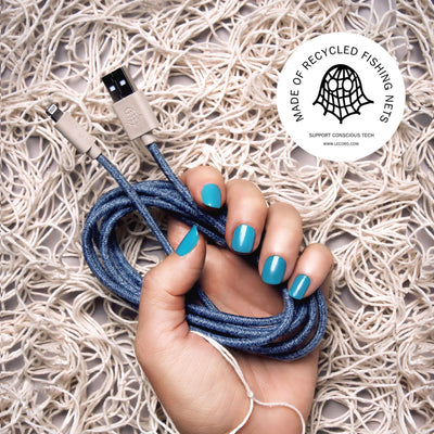 The world’s only Apple MFI certified charge and sync cable with connector shells made of recycled ocean fishing net plastics and braided with textile made of recycled PET (rPET) bottles.