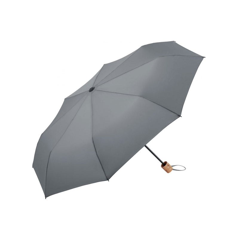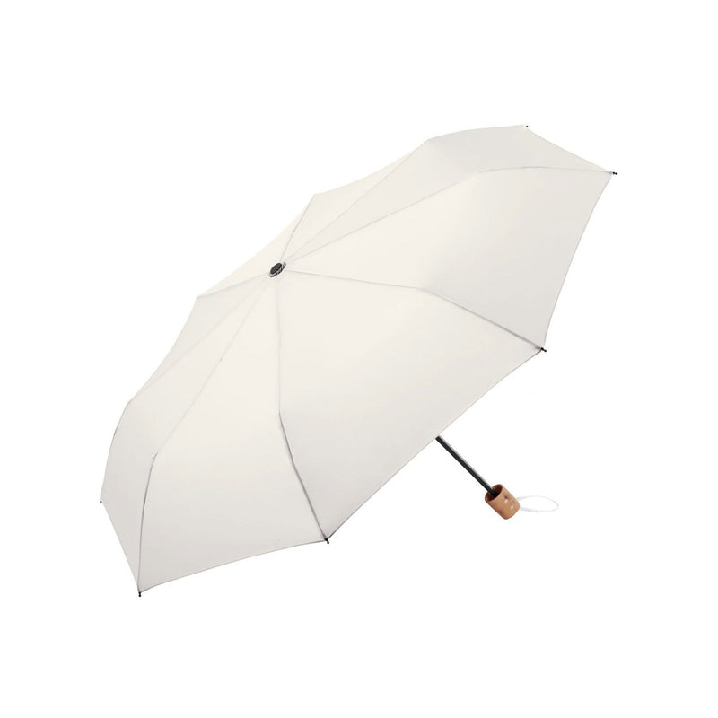 Easy to handle thanks to sliding safety runner, high-quality windproof system for maximum frame flexibility in stormy conditions, polyester Pongee waterSAVE® cover material made of recycled plastics and dyed using a water-saving process, wooden handle with promotional labelling option, sleeve with zipper can be used as a reusable shopping bag with compartment for the umbrella