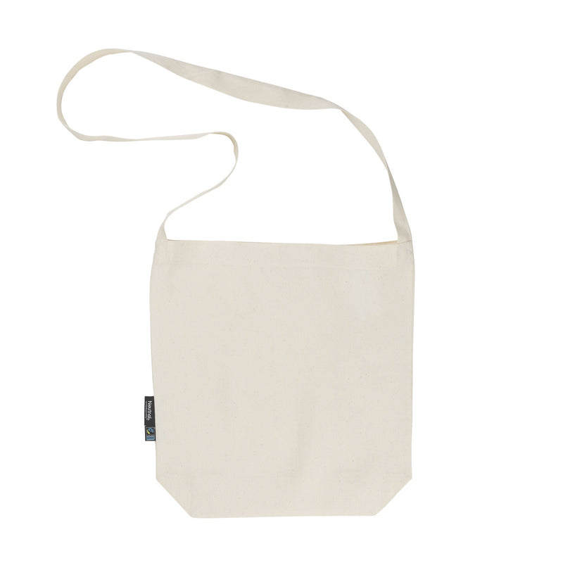 The bag is reinforced at stress points and is designed with a gusset at bottom to create a more spacious bag. Features one long crossover shoulder strap and has both Neutral® and Fairtrade flag labels at side.